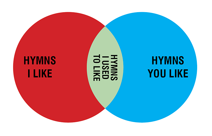Always remember, hymns I like is hymns I used to like if it also happens to be hymns you like. This hilarious Venn Diagram pretty much sums up anyone who doesn’t fully appreciate the new “1000+” hymnbook songs…